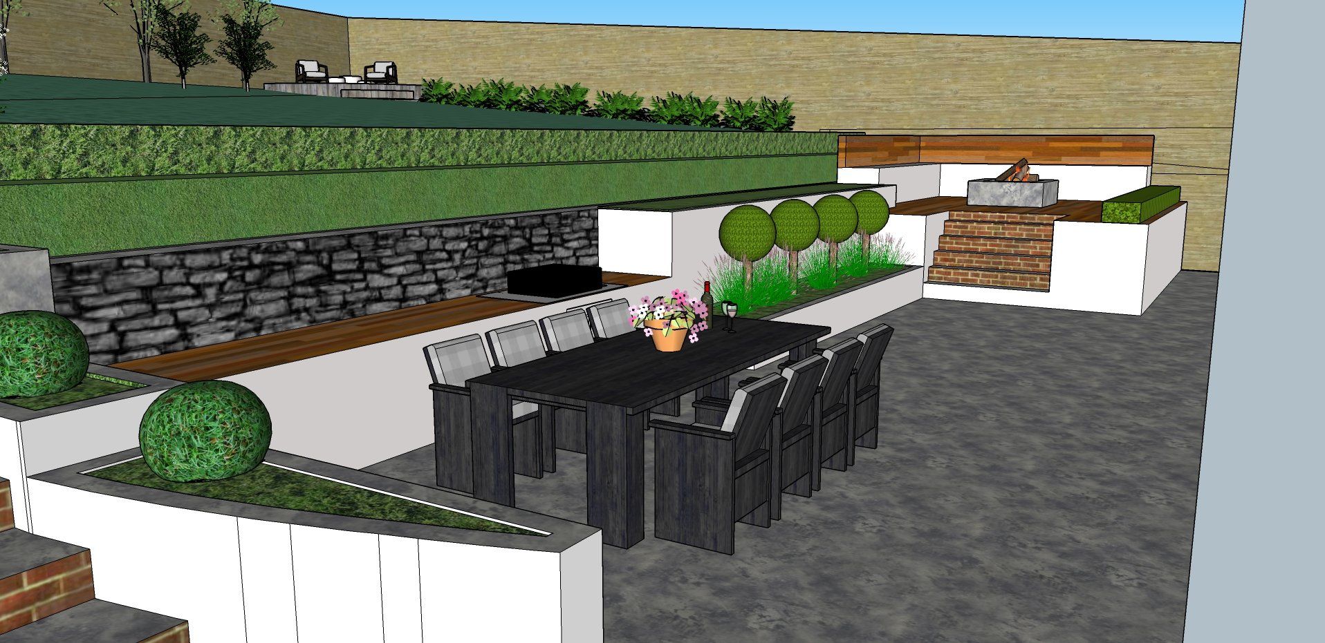 The photos below show the before, the plan (2016 SketchUp skills!), the apocalyptic destruction needed before the re-build could begin and then the wettest planting day ever undertaken as we worked through all weathers to make sure the garden was ready for a party.